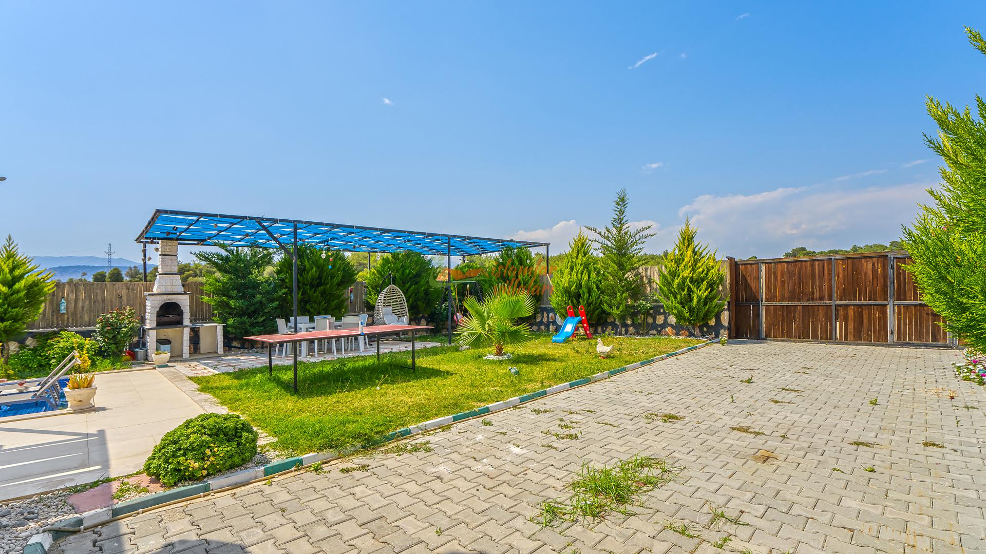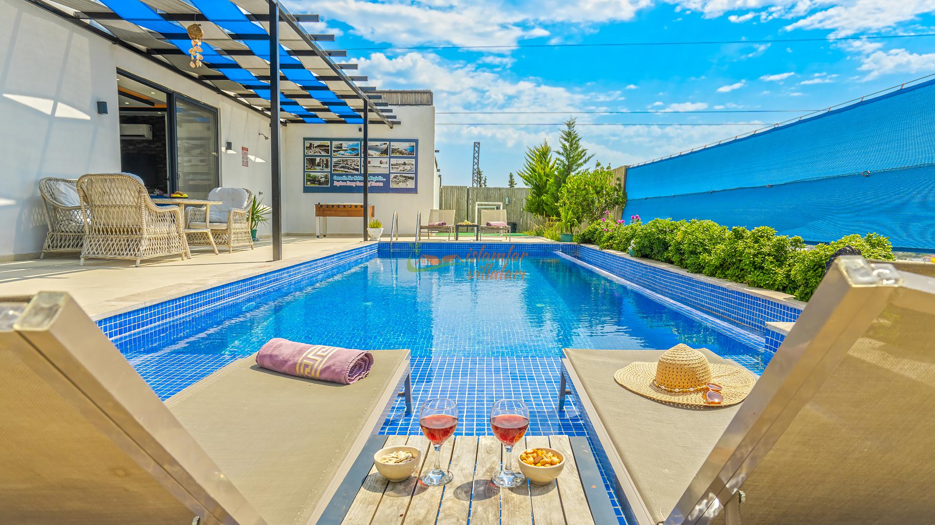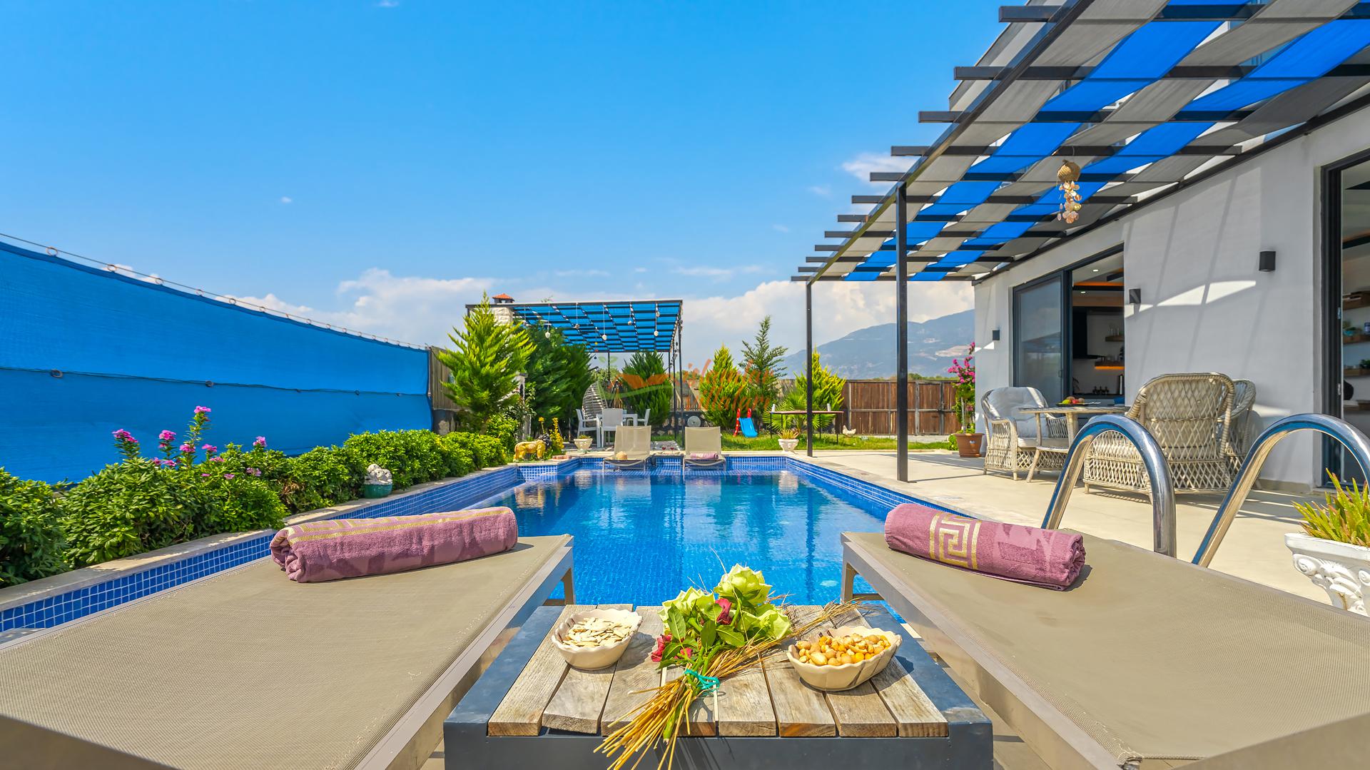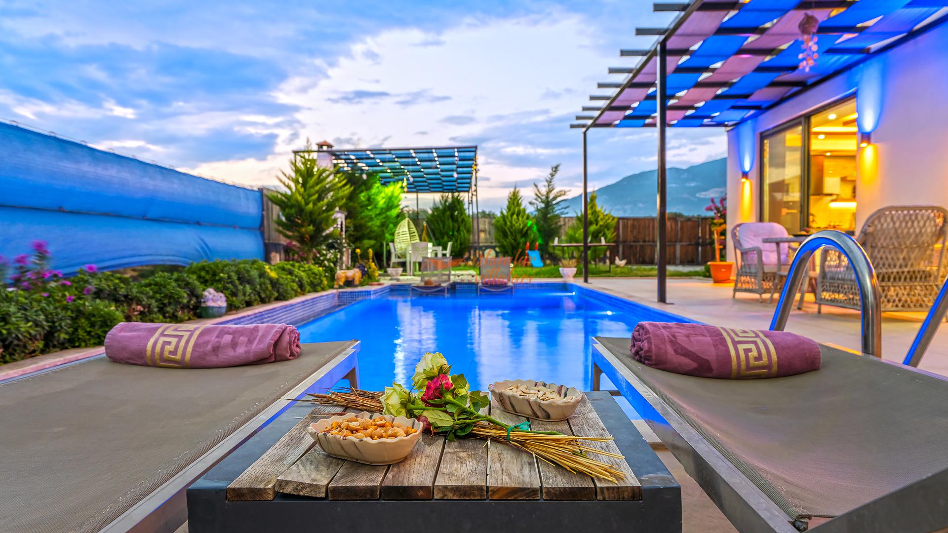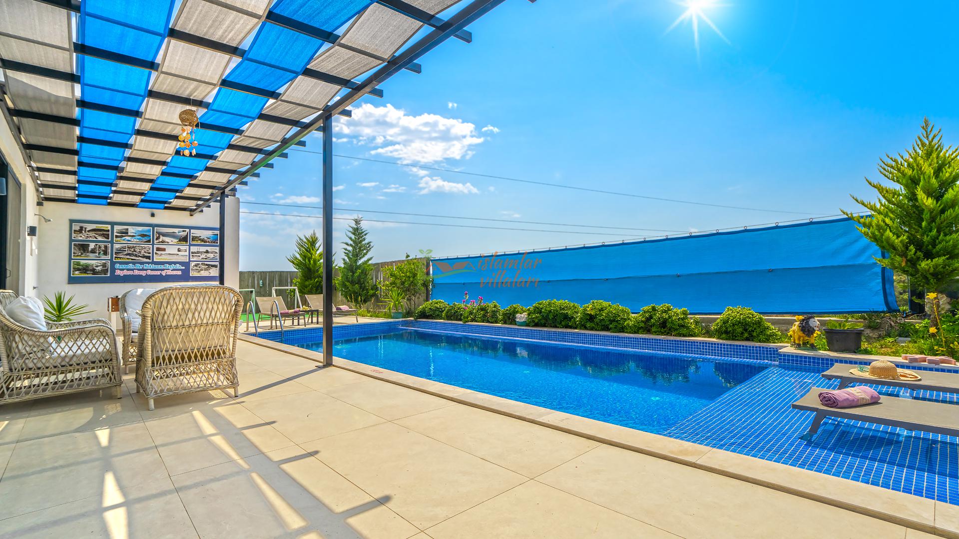 Korunaklı Alanlar: Villamızın havuz terası ve geniş bahçesi vardır, dışarıdan havuzu görünmeyecek şekilde yüksek hassasiyetle çevrelenmiştir. Ailenizle birlikte güven içinde havuzun tadını çıkarabilirsiniz.