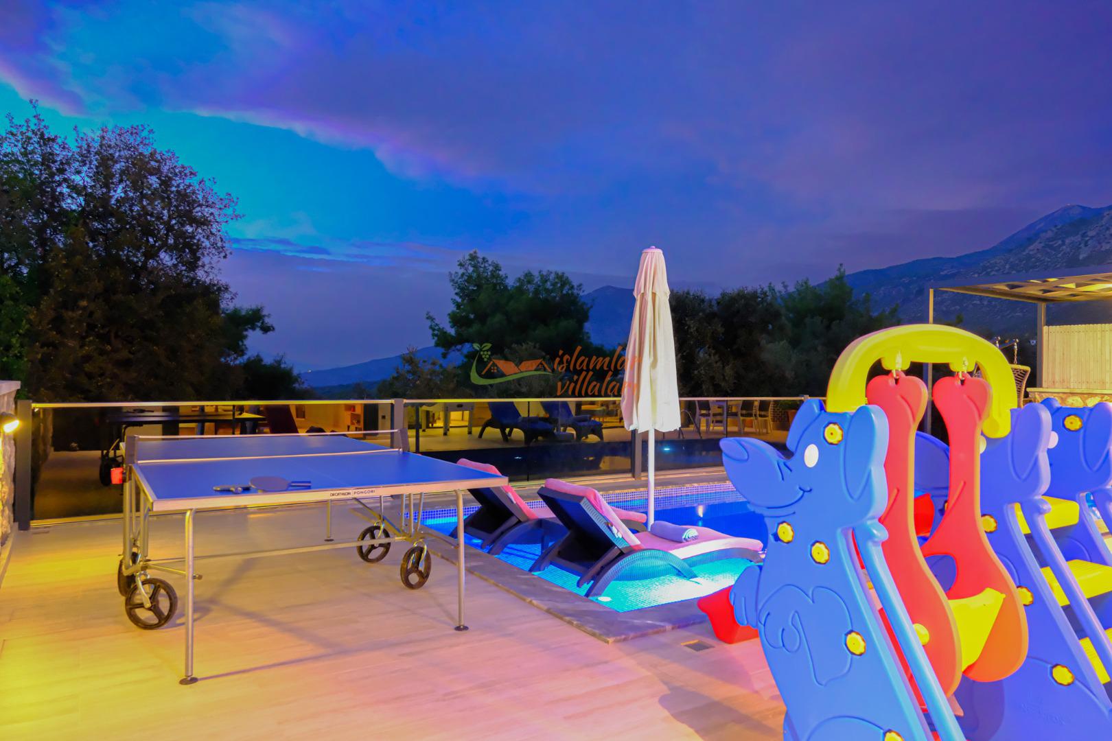 Çocuklar ve Yetişkinler İçin Eğlence: Küçük misafirlerimiz için yer alan oyun parkı ve keyifli anlar için eklenen salıncak, çocukların güvenle vakit geçirmesini sağlar; yetişkinler için ise masa tenisi ve langırt masası ile tatilinize heyecan katabilirsiniz.