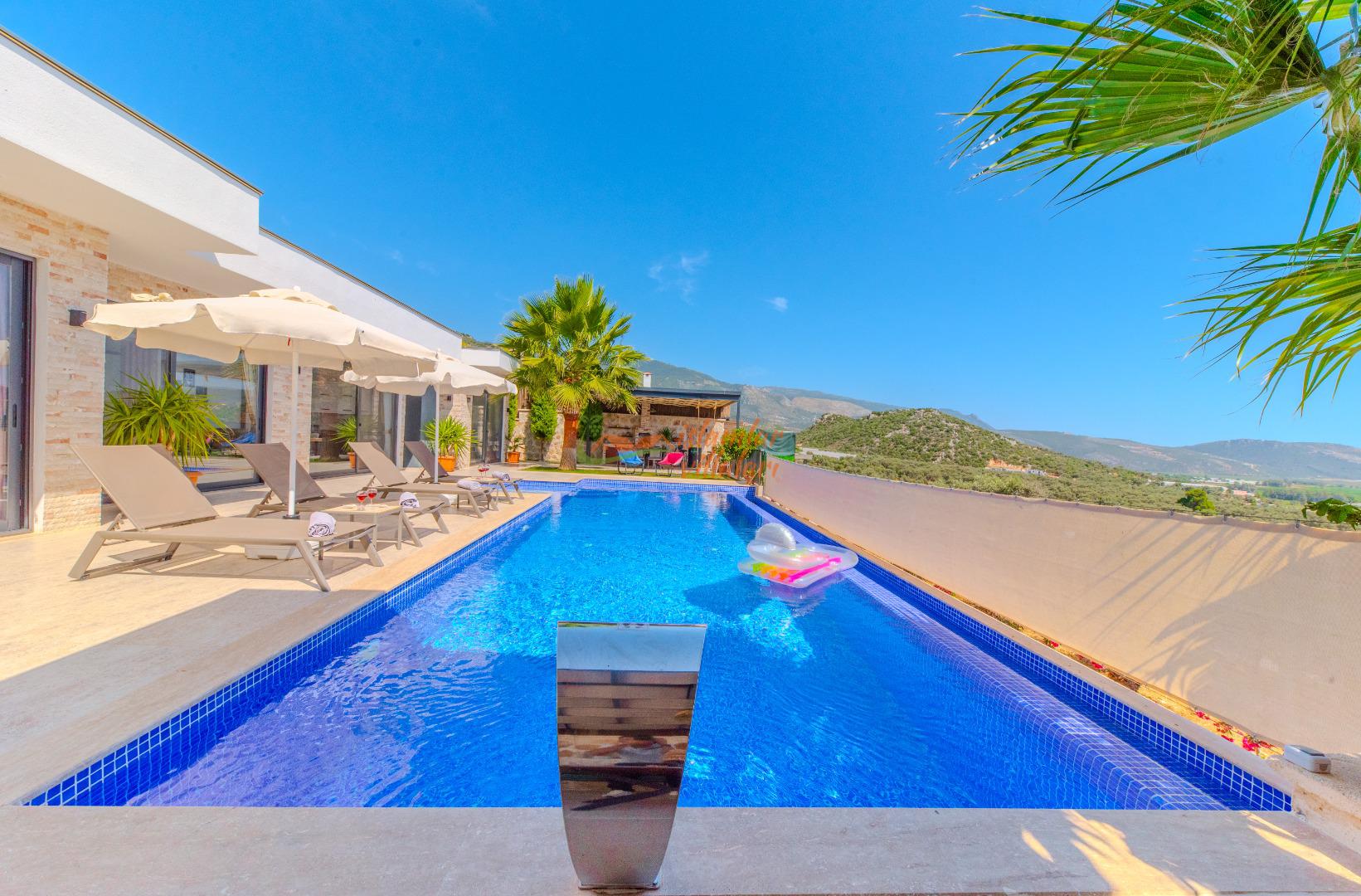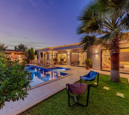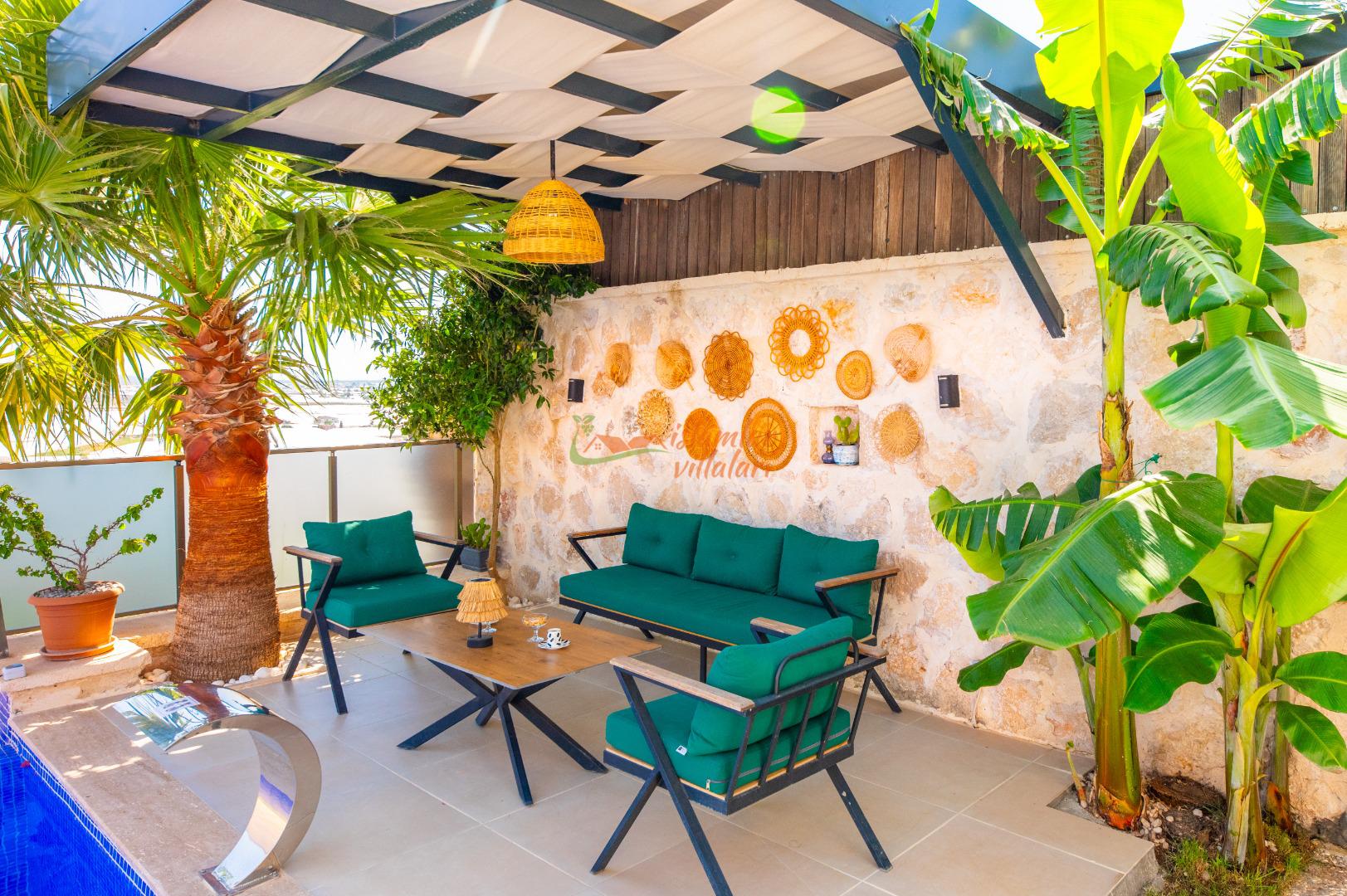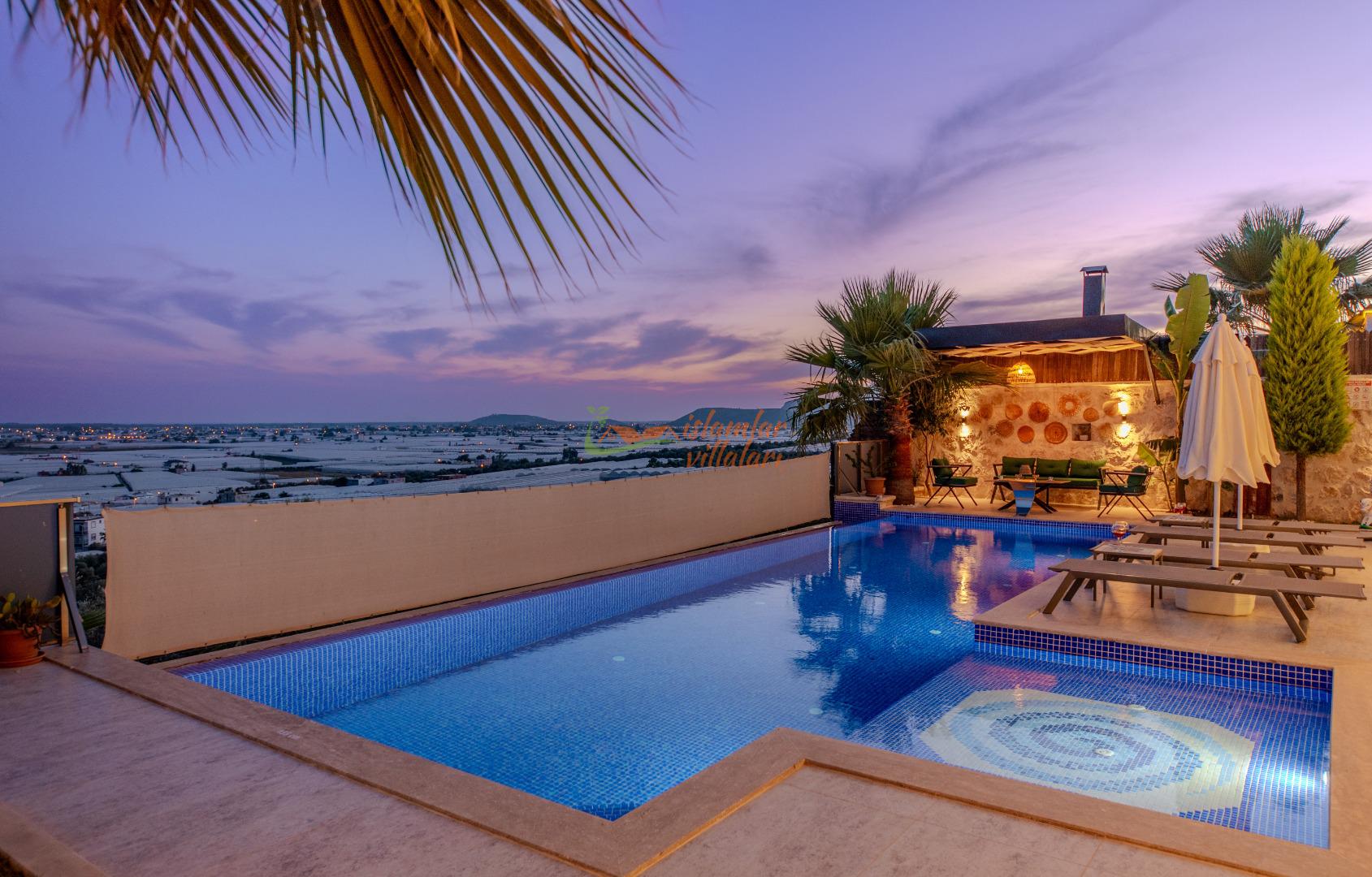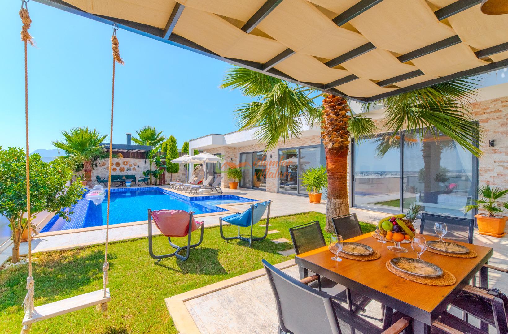 Geniş Havuz ve Muhafazakar Bahçe: Villamızın en dikkat çeken özelliklerinden biri olan geniş yüzme havuzu, size ferah bir kulvar alanı sunar. Havuz terası ve bahçesi korunaklı olup, dışarıdan görünmeden özgürce güneşlenebilir ve yüzebilirsiniz.