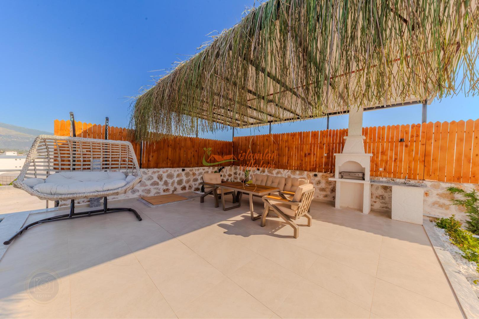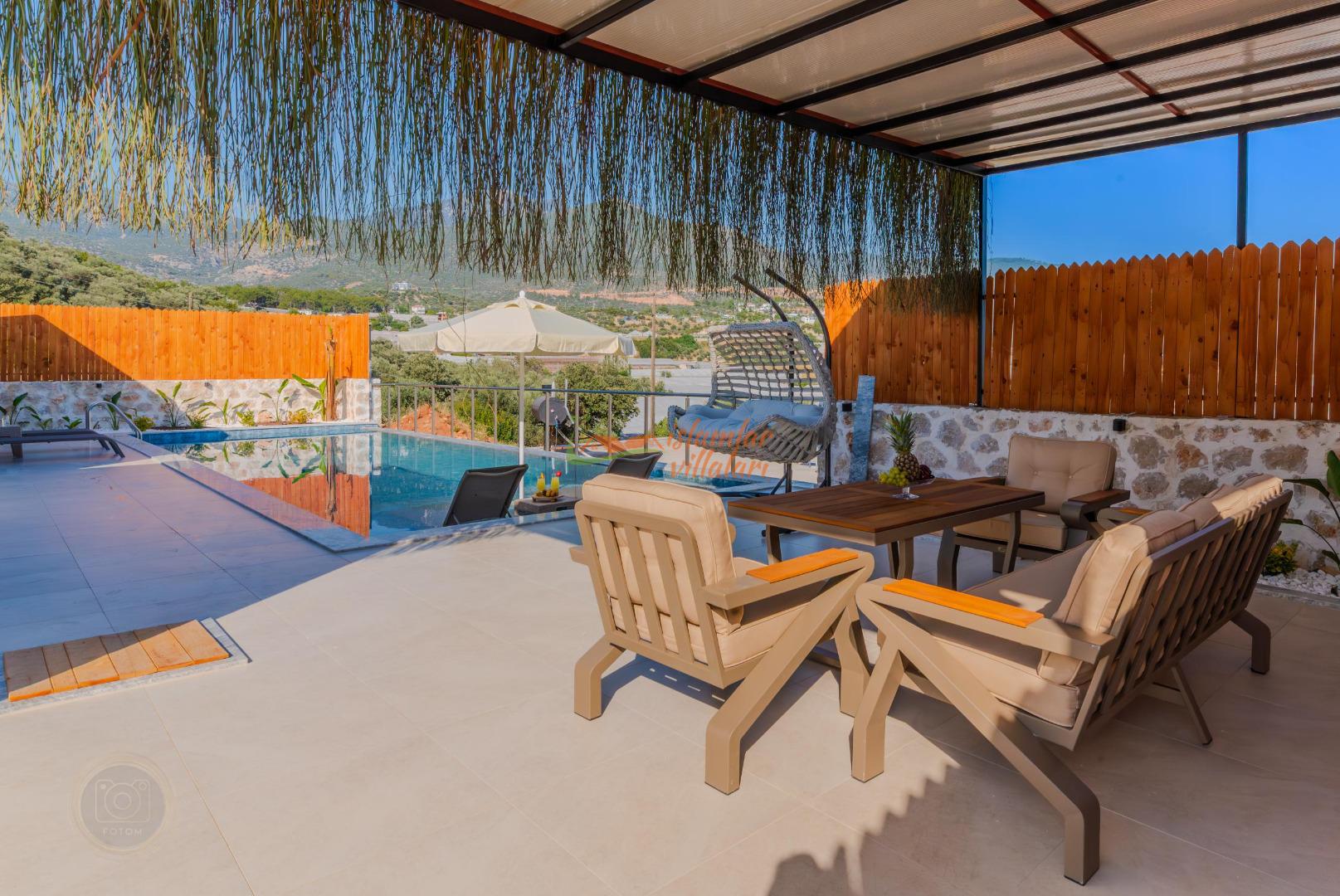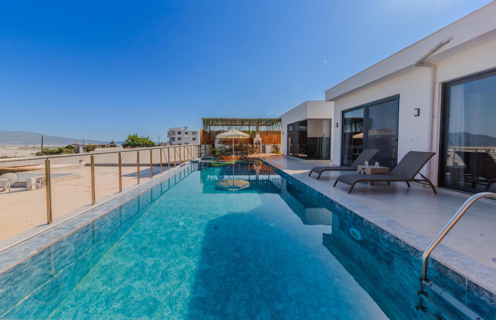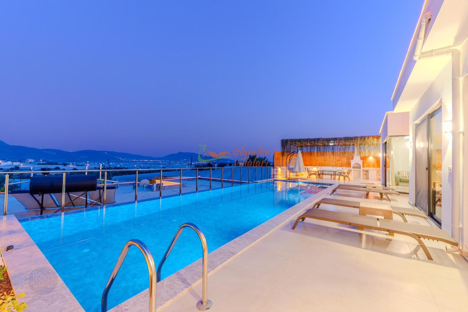 Geniş Havuz Terası ve Bahçe: Villamızın öne çıkan en büyük özelliklerinden biri olan geniş terasında gün boyu güneşin tadını çıkarabilir, şık bahçesinde akşam yemeklerinizi yiyebilirsiniz.
