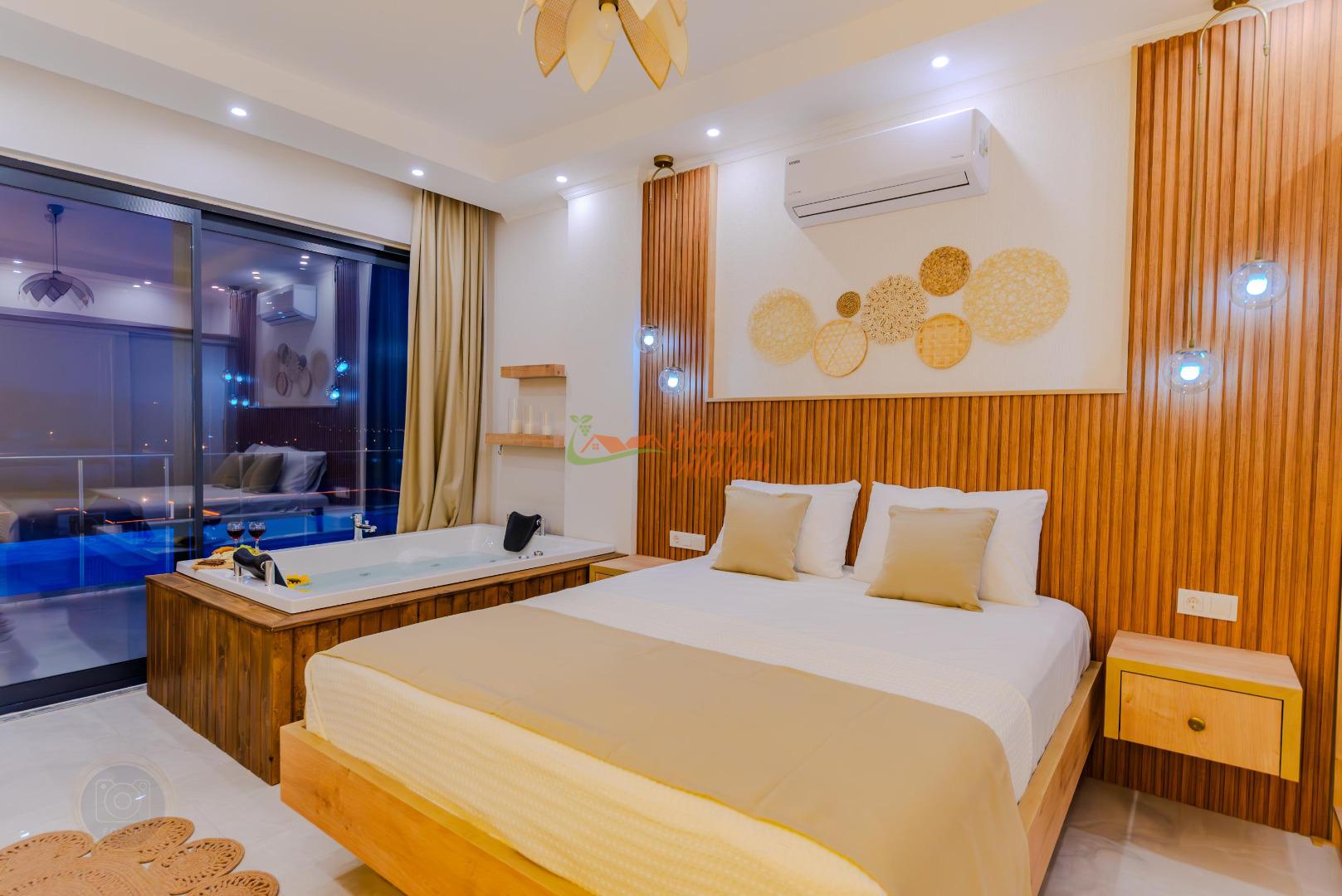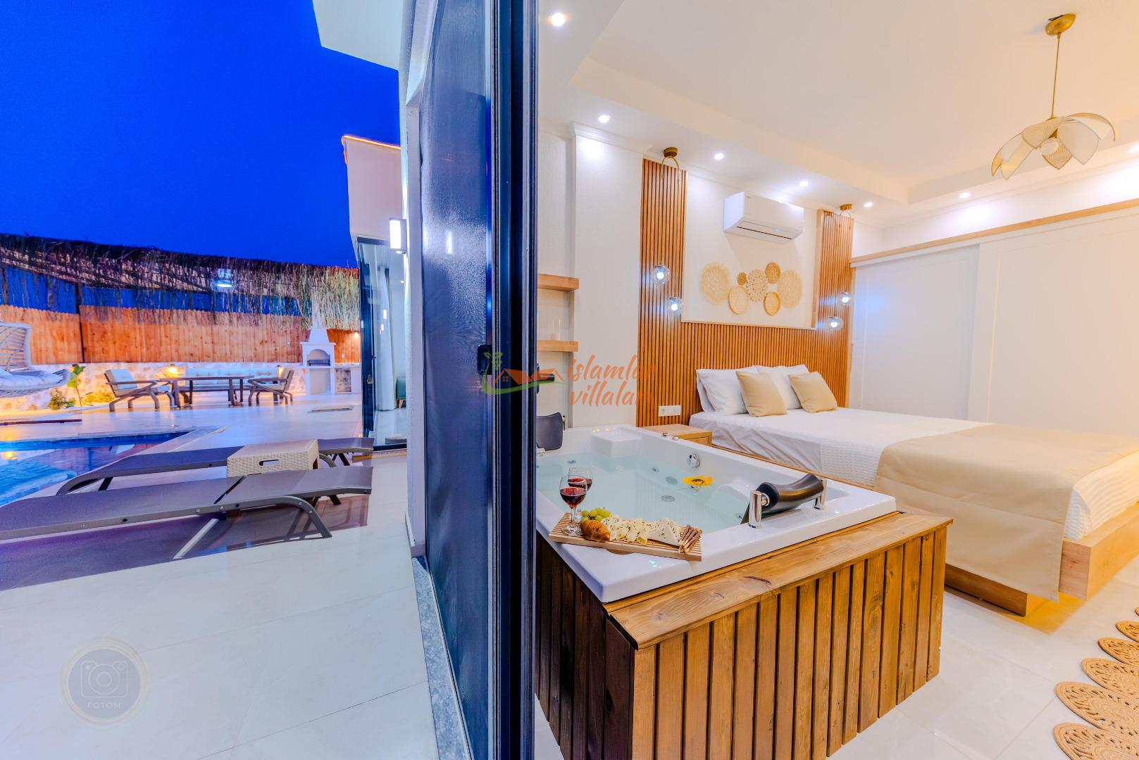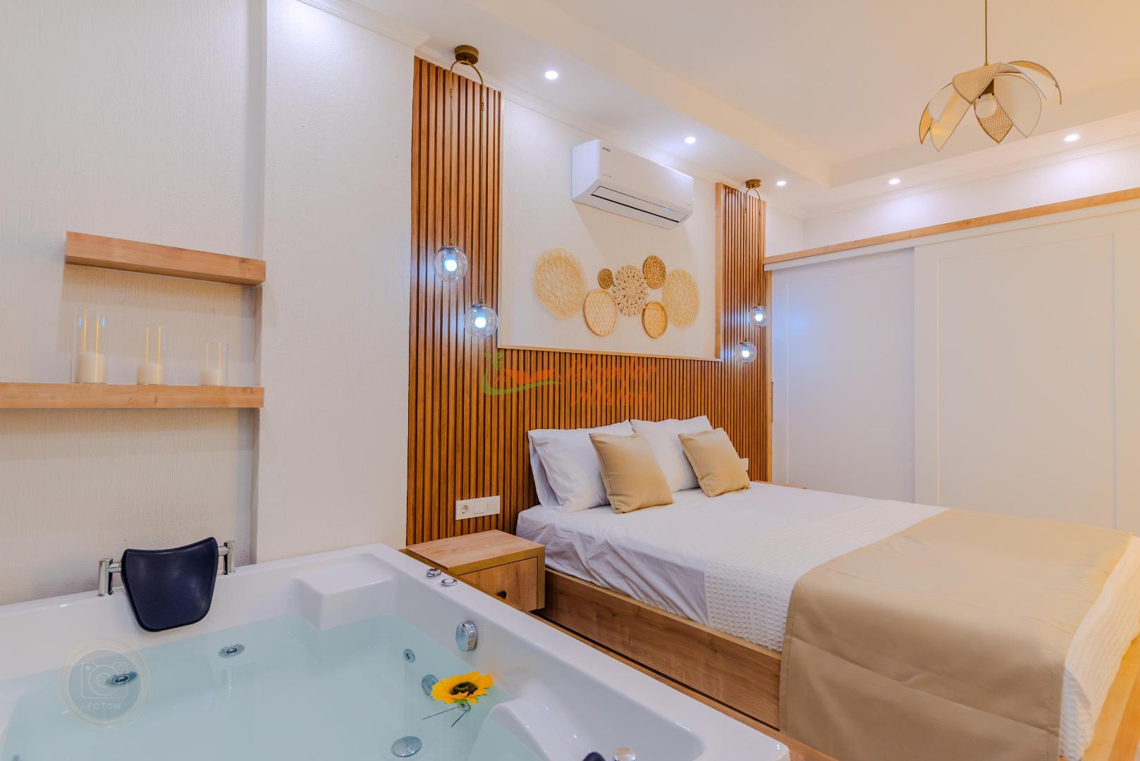 Lüks Jakuzi Deneyimi: Şık dekore edilmiş yatak odasında yer alan jakuzi, tatilinize dinlendirici bir dokunuş katar.