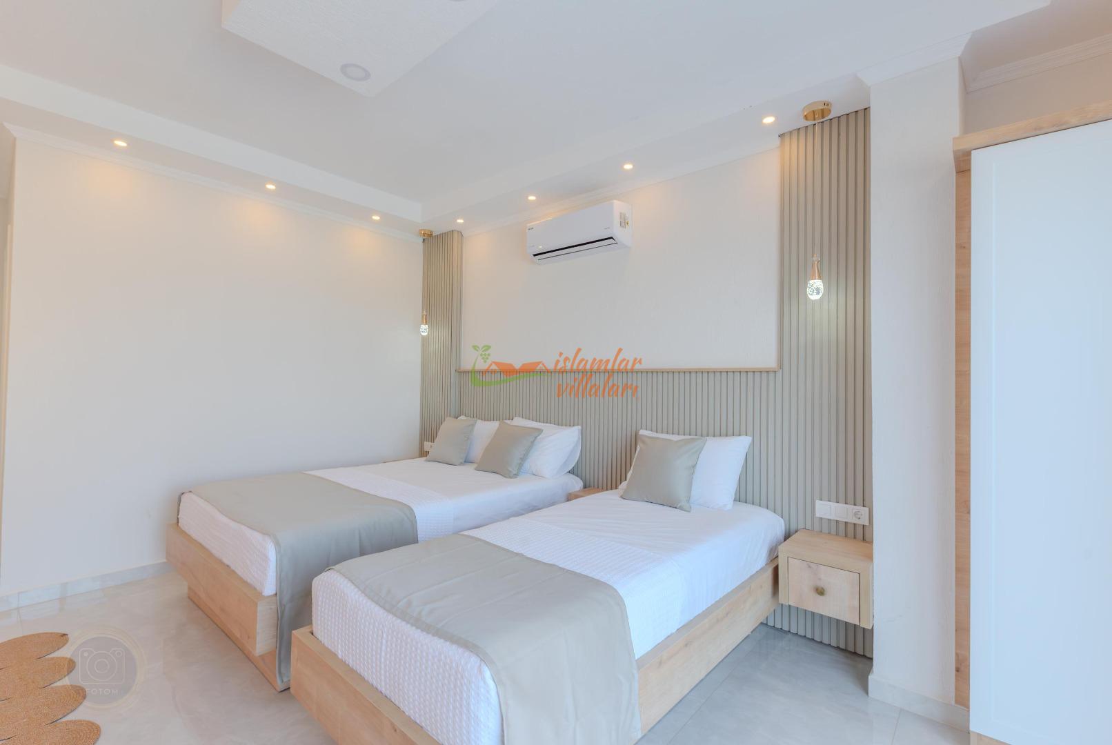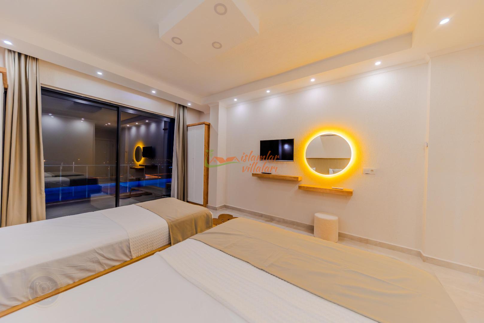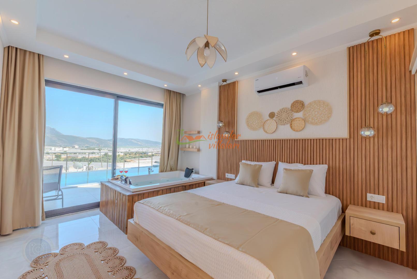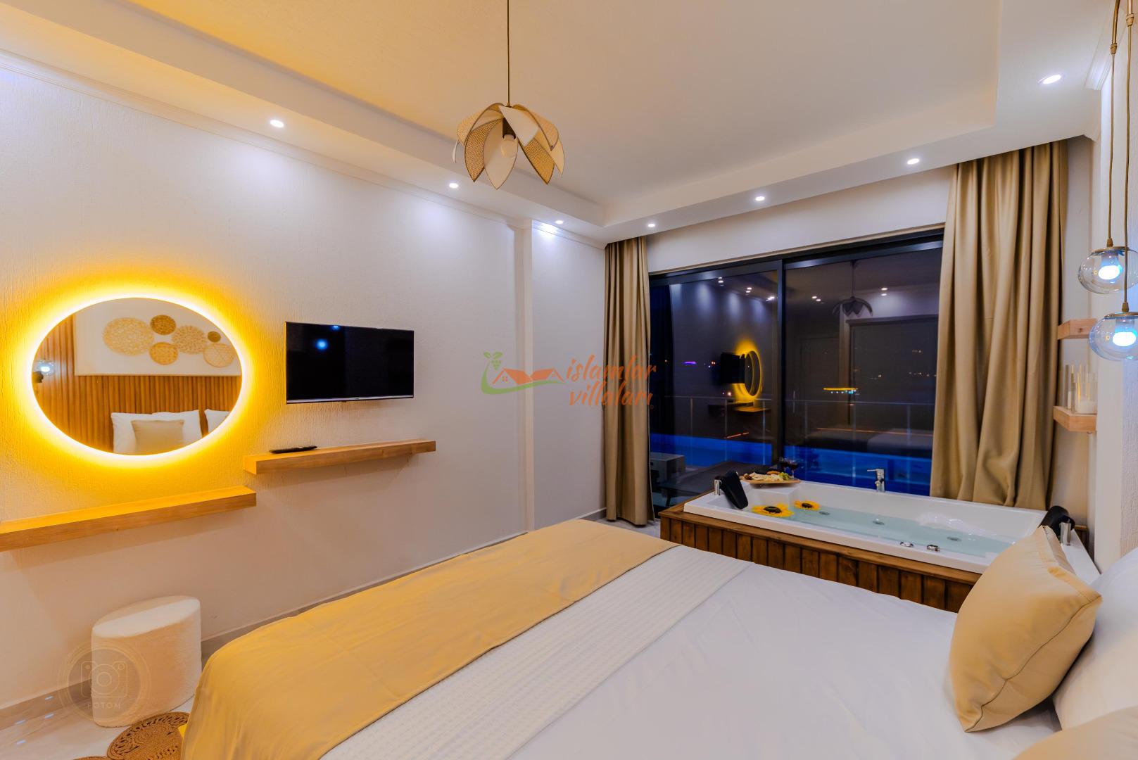 Lüks Jakuzi Deneyimi: Şık dekore edilmiş yatak odasında yer alan jakuzi, tatilinize dinlendirici bir dokunuş katar.