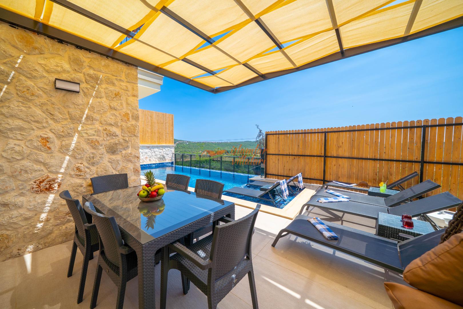 Korunaklı Havuz ve Bahçe: Villamızın havuzu, dışarıdan görünmeyecek şekilde korunaklı hale getirilmiştir. Sevdiklerinizle birlikte, yabancı gözlerden uzak, tamamen size özel bir alanda özgürce güneşlenebilir ve havuzun tadını çıkarabilirsiniz.